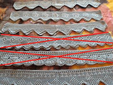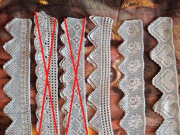 Vendo n. 4 coppie di pizzi / balze / bordure per impreziosire asciugamani o tendine, fatte INTERAMENTE con lavoro a MANO all'uncinetto.