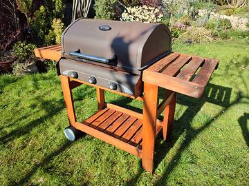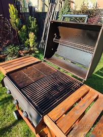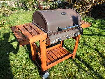 Vendesi barbecue a gas. Carrello in legno con griglia centrale composto da due piastre per una superficie totale di 65x50 e coperchio con termostato. Due piani di appoggio laterali 35x50. Piano appoggio centrale inferiore 65x50.