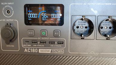 BLUETTI AC180 - pari al nuovo, perfettamente funzionante - la Power Station genera una corrente in uscita di 230V con potenza costante di 1800W e con picco fino a 2700W- sono presenti 2 prese in corrente alternata, alcune prese USB di tipo A ed 1 di tipo C con potenza di 100W - è dotata di caricatore wireless per caricare il cellulare appoggiandolo sopra - dispone di diversi modi di ricarica: attraverso la rete 230V, connettendola alla presa accendisigari o tramite il regolatore di carica MPPT integrato che supporta una ricarica solare fino a 500W - Tutte le funzioni di ricarica ed il funzionamento possono essere gestite da cellulare scaricando l'apposita applicazione -Se collegata alla linea elettrica di casa in funzione UPS, in caso di interruzione elettrica è in grado di ripristinare l'alimentazione delle utenze collegate in modo impercettibile (pochissimi millisecondi).