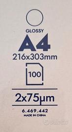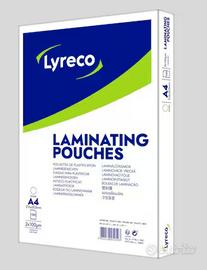 Pouches per plastificazione Lyreco A4 finitura lucida - conf. 100 pz Buste resistenti all'acqua, al grasso e allo sporco. Il documento plastificato viene saldamente incollato tra 2 fogli di plastica trasparente così da preservare i colori e proteggerlo nel tempo. Tutte le buste hanno gli angoli arrotondati per garantire un uso sicuro e maneggevole. Formato: A4 Finitura: lucida. Spessore totale mic dei 2 fogli: 150 (2 x 75) Confezione da 100 fogli. Ottimo rapporto qualità/prezzo.