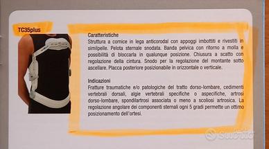 Struttura a cornice in lega anticorodal con appoggi imbottiti e rivestiti in similpelle. Pelota sternale snodata. Banda pelvica con ritorno a molla e possibilità di bloccarla in qualunque posizione. Chiusura a scatto con regolazione della cintura. Snodo per la regolazione del montante sotto ascellare. Placca posteriore posizionabile in orizzontale o verticale. (come da foto)