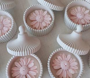 Vasetto realizzato in polvere di ceramica con al suo interno una cera profumata e una Margherita. Si può personalizzare in base al colore che a te piace idea regalo o bomboniera per il tuo evento. Il prezzo può variare in base a quanti pezzi occorrono.