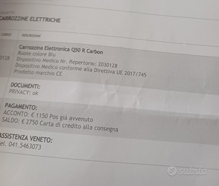 Carrozzina elettrica pieghevole portata 136 Kg peso 17 Kg velocita 6 Km/h in carbonio e magnesio, molto leggera e allo stesso tempo stabile e compatta, dimensioni Lungh. 923 mm x Largh. 570 mm x Alt. 928 mm