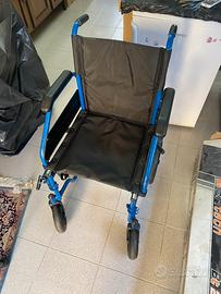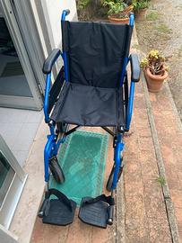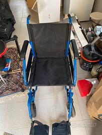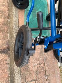 Carrozzina pari al nuovo ,comprata nel 2024 e usata due volte per uscire in giardino, pieghevole, con telaio stabilizzante in acciaio a CROCIERA SINGOLA e ruote antiforatura, struttura di colore blu.
