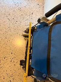 Sedia a rotelle compatta e pieghevole per il trasferimento di persone con ridotta mobilità. Con freni a leva, poggiapiedi e braccioli pieghevoli, comoda tasca per documenti. Utilizzata poche volte, come nuova