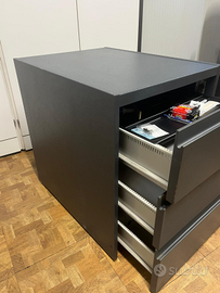 Vendo 2 cassettiere metalliche identiche, ciascuna con 3 cassetti, robuste e stabili, colore grigio scuro.