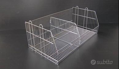 Ceste impilabili in filo di acciaio, utilizzabili come stoccaggio merce in magazzino o espositori al pubblico. Larghezza di due misure, 132 o 95 cm, con profondità di 50 cm e altezza di 30 cm. Disponibili 44 pezzi. Prezzo variabile in base alla quantità.