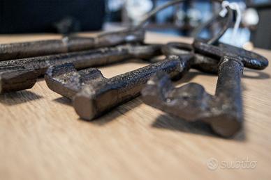 Chiavi antiche in ferro , oggetto da collezione o arredamento , chiavi d'epoca , intero mazzo come da foto 29€, misure altezza circa 27 cm fino ad anello portachiavi, largh. 14 cm, chiave grande alt. 18 cm, visibile a Pereto AQ 50 min. da Roma, posso anche spedire. Daniele 3385911292