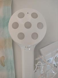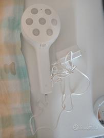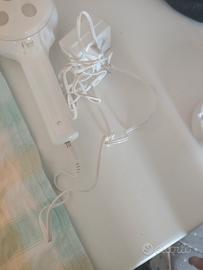 Questo dispositivo è il Clairol Cellutherapie VibroMassage System, un massaggiatore elettrico progettato per il trattamento della pelle. Funzione: Sistema di vibromassaggio per il corpo. Utilizzo: Progettato per essere tenuto in mano per massaggiare zone specifiche. Componenti: Il set include l'unità principale e un adattatore di alimentazione