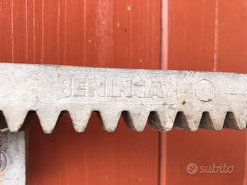 Vendo cremagliera per cancello automatico marca Beninca con 2 ruote (diametro cm. 9,5 circa - modello Comunello C-40 UNI 10083) e bulloni. Dimensioni guide: n.1 cm 103 n.1 cm 103 n.1 cm 77 Spessore cm 3x2
