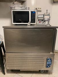 3 lavandini, lavastoviglie piatti, lavastoviglie bicchieri, friggitrice 4 cestelli, 1 macchina al gas con 8 fuochi, bollitore con 6 cestelli, 3 frigoriferi, 1 frigo congelatore, Forno Professionale Rational, abbattitore, 8 banchi d'appoggio con diversi misure, ecc