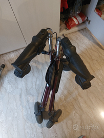 Deambulatore a 3 ruote con sacca portaoggetti. Pratico e leggero, si chiude facilmente per essere trasportato. In auto occupa poco spazio. Nuovo, mai utilizzato.