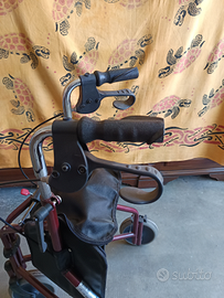 Vendo deambulatore a tre ruote dotato di freni ai manubri e sacca porta oggetti.