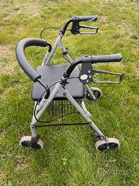 Deambulatore con ruote larghe e gomma morbida (silenziose), freni bloccanti e comoda e robusta seduta. Adatto per essere utilizzato anche all'esterno. Condizioni ottime, è stato utilizzato solo in due occasioni.