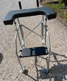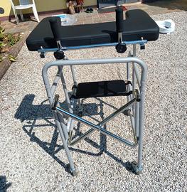 Deambulatore pieghevole in acciaio con sedile comodo da mettere e togliere. Tavolino appoggia gomiti e oggetti