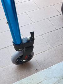 In alluminio pieghevole, blu, 2 ruote anteriori e puntali posteriori con freno a pressione autobloccante. Manopole di appoggio in perfetto stato (non consumate).