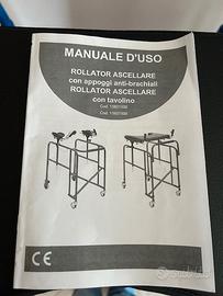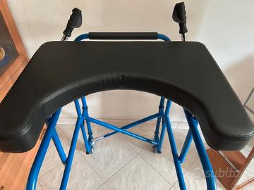 Pieghevole con tavolino incavo. Costruito in acciaio con 4 ruote piroettanti di cui due con freni. Supporti regolabili in altezza. Appoggi antibrachiali regolabili in altezza e profondita'.