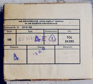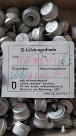 Archeologia industriale del 23 febbraio 1989 in scatole originali da 100 pezzi made in Germany (prodotti in Germania dell'EST). Lot di autodiodi a incastro, positivi e negativi da 400 volt/10A. Utilizzati prevalentemente per fare raddrizzatori a ponte Winston a uso dei motori di proiettori cinematografici e altro come l'uso dei semiconduttori per led, laser, ecc. Tra i materiali dei componenti risultano: Silicio (Si), Germanio (Ge) e varie terre rare. Utili a fini di studio e ricerca o come pezzi di ricambio per oggetti vintage (proiettori cinematografici, radio, apparecchi fotografici, applicazioni industriali, batterie, ecc). Produzione: febbraio 1989, Germania Est. Modello: SY 171/4 Origine: VEB Mikroelektronik "Anna Seghers" Neuhaus am Rennweg. Marchio di qualità: AK2