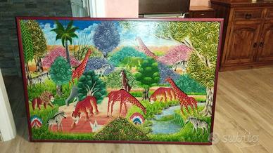 Dipinto ad olio (?) stile Haitiano naive con classica rappresentazione di animali selvatici, condizioni come da foto (assenti difetti o danni al dipinto), dimensioni altezza cm 96 - lunghezza cm 144. su cornice in legno dietro tela. Importante: non effettuiamo spedizione dell'oggetto, solo ritiro in loco con automezzo di capienza sufficiente (verificare misure) date le dimensioni del dipinto. Grazie.