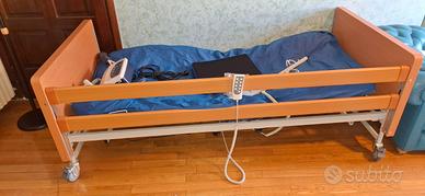 Letto in legno con sponde integrate regolabili, 4 ruote piroettanti e frenanti, rete articolata che permette regolazione elettrica di schienale, zona cosce/piedi, regolazione del piano letto in altezza, asta con triangolo solleva paziente, materasso antidecubito per pazienti ad alto rischio. dimensioni 215x102. Pari al nuovo perchè acquistato il 7 marzo 2026 e usato solo tre giorni. Sanificato. Garanzia di 24 mesi, documentazione e istruzioni disponibili. Disponibile fattura di acquisto solo per presa visione. Ritiro e trasporto a carico dell'acquirente. Dispositivo medico conforme alla direttiva 93/42 CEE D.M.