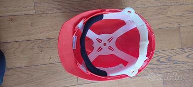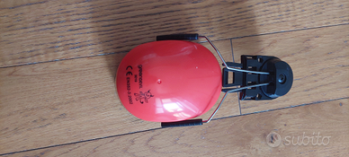 Elmetto protettivo, nuovo mai usato, completo di cuffie antirumore e visiera in maglia metallica.