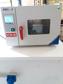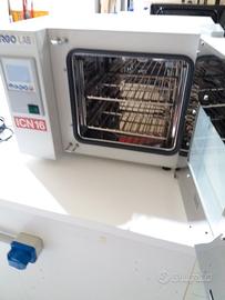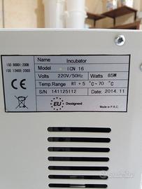 Campo di lavoro: da 5° oltre temperatura ambiente fino a 70°C. Volume utile 16 litri. Variazione della temperatura a 37°C: ±0,3°C. Porta in acciaio inox con ampia finestratura in vetro. Sistema di controllo digitale tipo PID con ridotto numero di tasti di regolazione per una facile impostazione dei parametri. Display digitale a due colori, LED multicolor per le diverse fasi di riscaldamento e allarmi acustico visivi. Timer digitale con range di programmazione 1 min - 99 h e 59 min. e funzionamento in continuo. Funzione "partenza ritardata" del ciclo di riscaldamento. Funzione "temperatura sicura": limitazione temperatura di lavoro per la protezione dei campioni