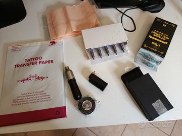 Kit usate 3 volte, completo di Macchina per tatuare a batteria Aggi sterilizzate e non per pratica Pelle finta per pratica Inchiostro nero Carta per trasferimento tatuaggi