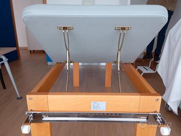 Lettino per visita medica in ottimo stato, in legno robusto, schienale regolabile, piano superiore imbottito e rivestito in ecopelle lavabile, dotato di porta rotolo carta e di staffe (asportabili) per visita ginecologica.
