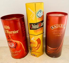 3 bottiglie di liquori pregiati in contenitori vintage in latta: