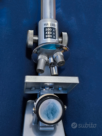 Microscopio vintage del marchio Pan Ludo. Un classico per esplorare il mondo microscopico.
