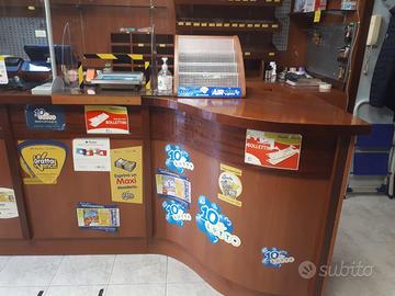 Arredamento per negozio in legno composta da bancone distribuzione merci ( dim: mt 3) , numero 3 vetrine ( dim: mt 2.20 , l 80cm, profondita' 40 cm ) , retro bancone composta da scaffalature in vetro distributore sigarette , celino munito di fari