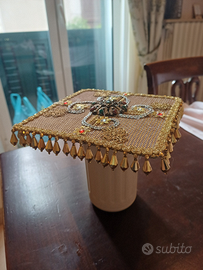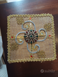 Palla liturgica realizzata a mano con tessuti pregiati e filati oro e argento, arricchita con pietre semipreziose. La particolarità di questa animetta è data dalla frangia laterale pendente. Rende l'oggetto adatto a messe solenni.