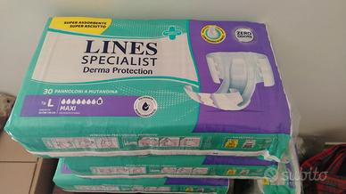 Vendesi 8 confezioni da 30 pannoloni a mutanda l'una di marca lines specialist derma protection nuovi . In blocco vendo a 100 € altrimenti 15 euro alla confezione. Taglia L (oltre 110 cm) . Inoltre vendo a 10 € una confezione di Tena pro skim pants da 12 pannolini singola oppure 5 € nel intero blocco. Per informazioni scrivere o chiamare, Riccardo.