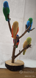 5 pappagallini fatti all' uncinetto su un ramo, base in legno rotonda. Altezza cm. 38.