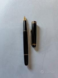 Questo oggetto è una penna stilografica Montblanc Meisterstück, un noto strumento di scrittura di lusso introdotto per la prima volta nel 1924. o Design: Presenta un corpo in resina pregiata nera e finiture dorate. o o Pennino: È dotata di un pennino in oro 14 carati, spesso rifinito a mano. ® o Caratteristiche: Il cappuccio riporta l'iconico emblema a stella bianca del marchio.