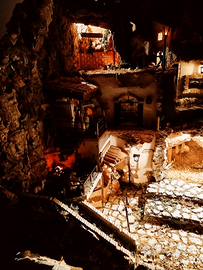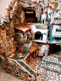 Presepe fatto a mano, curato nei minimi particolari. Dotato di parti elettriche che fanno muovere i personaggi, come la pizzaiola, il mulino, la fontana. Di seguito le misure : 126 L 65 P 85 H