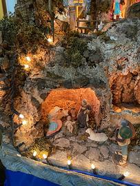 Vendesi bellissimo presepe con piu'di 40 statuette in terracotta con luci + mulino in movimento cascata+ gioco dello specchio mis :lungh.1,20 largh.70 alt60 cm