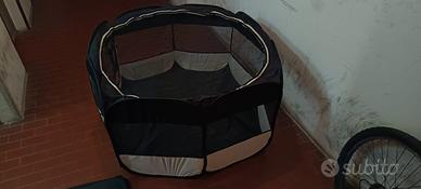 Il box è usato, in buone condizioni, ha solo due cuciture rifatte, vedi le foto, perchè i cuccioli avevano rotto la rete perchè cercavano un altra via d'uscita.