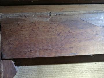 Cornice lignea antica, probabilmente coeva o di poco posteriore, con ridipinture e segni d'uso.