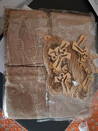30 Sacchetti porta confetti per cerimonia in iuta con croce in legno e corda di canapa. Nuovi, confezione integra