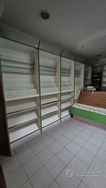 Scaffalature miste in legno utilizzate per l'esposizione di libri, giornali e altri articoli. Vendita per cambio attività Ritiro a carico dell'acquirente