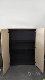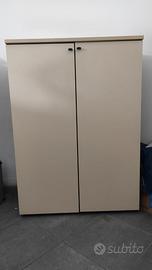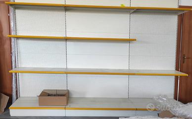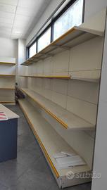 Scaffalatura da esposizione tutta in ferro di 21 m lineari con 4 armadietti con ante scorrevoli e circa 50 mensole ad incastro, modulabili, pareti lisce e con fori per incastro ganci (forniti assieme); 5 armadietti da ufficio in legno con ripiani in metallo e 2 scrivanie da ufficio lunghezza 260 cm. Armadietti e scrivanie vendibili anche separatamente a ?30 cad1.