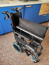 Sedia a rotelle pieghevole con poggiapiedi rimovibili. Usata ma ancora funzionante come ricambio. Larghezza seduta 43 cm. Ingombro sedia piegata 25 cm