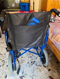 Sedia a rotelle nuova con ruote posteriori più ampie, sacca dietro allo schienale, con poggiapiedi. Ottima da usare anche per strada.