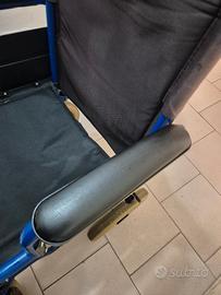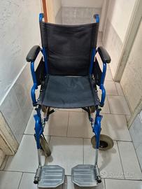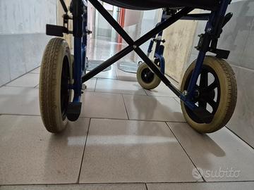 Vendo sedia a rotelle- carrozzina utile per disabili o anziani o per momentanea ridotta deambulazione per infortuni. Il telaio e quasi perfetto, la stoffa e l'imbottitura della seduta e dello schienale con tasca portaggetti sono integri, lo schienale è solamente scolorito dal sole, pedane poggia piedi regolabili non rotte poiché di metallo richiudibili e sganciabili per il trasporto. I poggiabraccia sono reclinabili per facilitare l'accesso ai lati della carrozzina per traslazione da un letto o da una sedia. Ha due gommini su cui puntare i piedi ed inclinare la carrozzina per salire sopra i marciapiedi. Le ruote anteriori sono morbide e non dure e rigide e assorbono bene le sconnessioni della strada. Sulla seduta ha due pratiche maniglie da tirare su e la carrozzina si rinchiude ed entra bene nel bagagliaio di una utilitaria. Le misure sono le seguenti: Altezza da terra alla maniglia: 92cm; Larghezza seduta max:44.5 cm; Schienale:43cm; Profondità seduta:42cm; Profondità con poggiapiedi:90cm; Profondità senza poggiapiedi:64cm; Può entrare senza problemi in ascensori, passare sotto le porte poiché la se dia a rotelle è larga in totale circa 55cm. Prezzo trattabile e valuto scambi o permute con chitarre,bassi,amplificatori e testate ,pedali e pedaliere,custodie rigide per chitarra e basso, pezzi di ricambio per fiat 500 d'epoca e piaggio bravo/si/boxer/ciao e simili,funko pop.