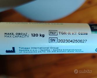 Vendo sedia comoda wc per anziani, resistente fino a 120kg,leggera e sicura piedini regolabili e pieghevole MAI USATA!! ancora nella sua scatola, stata tolta dalla scatola solo per fare le foto. Prezzo 50 euro