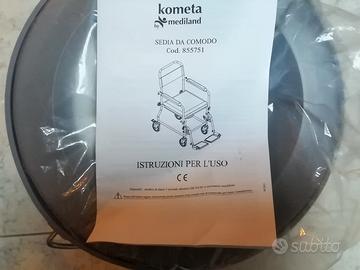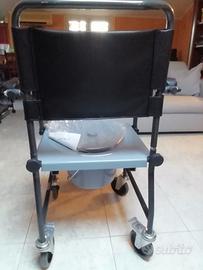 Sedia per disabili seminuova. Seduta con foro centrale, con sottostante secchio removibile, per la raccolta di deiezioni. Interamente lavabile e mobile su rotelle. Ritiro in zona.