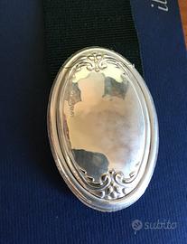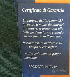Vendo segnapagina realizzato in tessuto verde rigato orizzontalmente e una applicazione in fondo a forma ovale in argento 925 della casa I preziosi di Cerdelli. E' ancora nella sua scatola, mai stato utilizzato. Può tornare utile per fare un dono ad un entusiasta lettore. Le misure sono: tessuto 30x3 cm.; ovale in argento 5x3,5 cm.