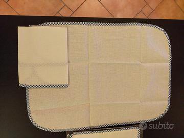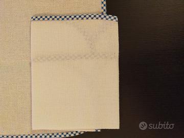 Set composto da busta 29X18 completa di tovaglietta 58X40 e tovagliolo 35X35 . Tutto in tela AIDA da ricamare e bordato in quadrettino bianco e blu. Posso spedire a 2 euro con busta postale.