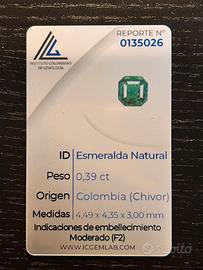 Splendido smeraldo colombiano certificato, ottima purezza 0.39 Ct, 4.49 x 4.35 x 3.00 mm Il gioiello viene corredato di certificazione